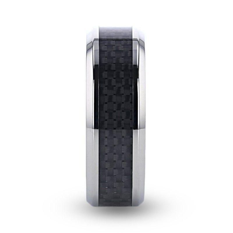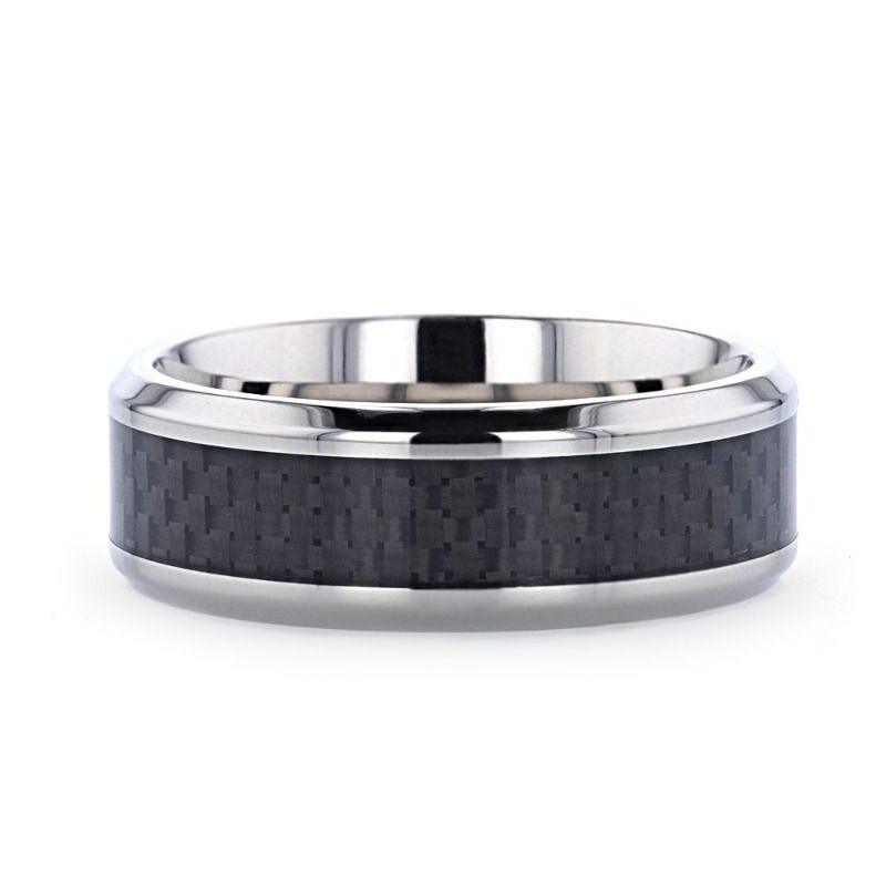 High tech carbon fiber is joined together with the durability of Titanium in this line of Black Carbon Fiber Wedding Bands. This comfort fit wedding band is a flat style with beveled edges. The black carbon fiber is inlaid seamlessly into the center and then an extremely scratch resistant resin is applied over it to protect the carbon fiber from wear.