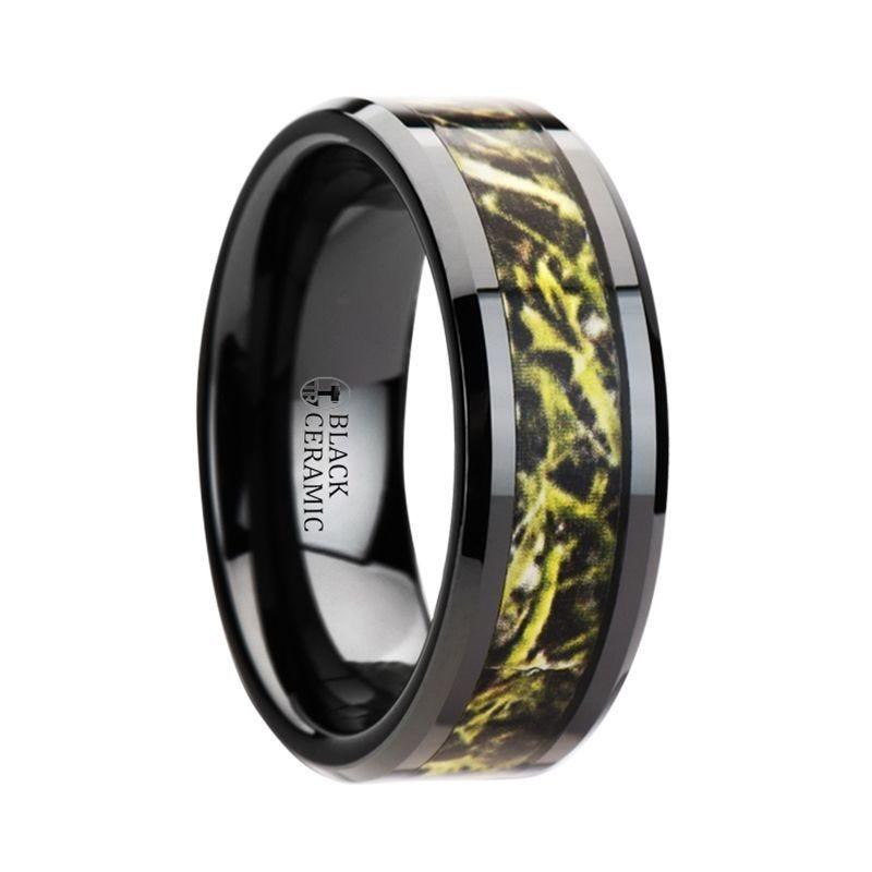 EVERGLADE Black Ceramic Wedding Band with Green Marsh Camo Inlay Ring - 8mm