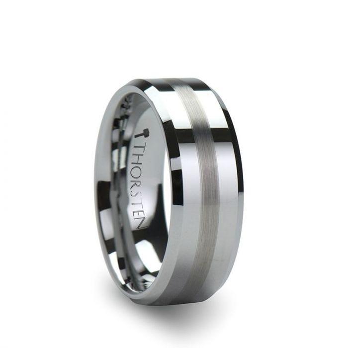 This elegant Tungsten Carbide ring by Thorsten features a 2mm wide brushed stripe running down its center and beveled edges and can be worn as a wedding band or promise ring.